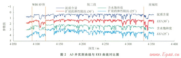 2為相應(yīng)角度的EEI曲線與實(shí)測(cè)的泥質(zhì)含量曲線(Vsh)、含水飽和度(Sw)曲線的比較圖,從圖2中可以看出,EEI(30°)與泥質(zhì)含量曲線具有很好的一致性,而EEI(25°)與含水飽和度曲線具有很高的相似度,氣田內(nèi)的其他井也具有類似的情況。