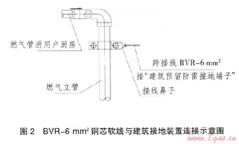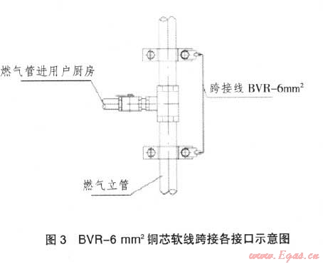 a)對于采用無縫鋼管的立管,當(dāng)立管高度不大于30m時,燃氣立管的頂端宜用BVR-6mm2銅芯軟線與建筑接地裝置相連,具體做法見圖2。底端與燃氣引入管閥門連接處用BVR-6mm2銅芯軟線跨接,跨接電阻不大于0.03Ω。對于燃氣立管高度為30m以上的建筑,需從30m開始,每隔不大于6m(一般為兩層)與建筑預(yù)留的防雷接地端子相連一處,做法與立管頂端的防雷接地做法相同;b)對于采用鍍鋅鋼管絲扣連接的立管,因各連接口采用聚四氟乙烯生料帶做密封材料,造成立管連接口不導(dǎo)通,各接口處須用BVR-6mm2銅芯軟線跨接,具體做法見圖3?,F(xiàn)有一種新型密封膠,導(dǎo)電性能良好,可作為立管絲扣連接的密封材料,現(xiàn)正在研發(fā),若能推廣應(yīng)用,各接口處就無需再做跨接了。