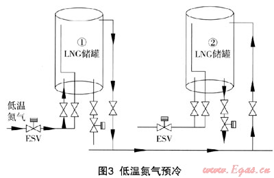 ② 低溫氮?dú)忸A(yù)冷時建議根據(jù)能量級梯使用原則,充分利用氮?dú)?,從而?jié)約液氮成本,參考工序如圖3:低溫氮?dú)鈴?號儲罐下進(jìn)液管進(jìn)、BOG氣相管出,從BOG氣相管進(jìn)2號儲罐,從2號儲罐出液閥出,最后在空溫氣化器后管道進(jìn)行放散。
