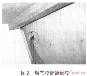2010年11月5,溫州市區(qū)康泰大廈一住戶廚房?jī)?nèi)發(fā)生一起燃?xì)獗ㄊ鹿?,造?人受傷、2戶建筑受損,爆炸原因系老鼠咬破膠管引發(fā)燃?xì)庑孤?。膠管被鼠咬是用戶家中安全用氣的最大隱患之一,每年冬春兩季鼠患最為嚴(yán)重。統(tǒng)計(jì)數(shù)據(jù)顯示,2009年公司供氣區(qū)域內(nèi)發(fā)生230起有關(guān)膠管隱患處警,其中膠管被鼠咬有76起;2010年共發(fā)生有關(guān)膠管隱患處警200起,其中膠管被鼠咬有93起,進(jìn)而發(fā)生爆燃的有5起。通常用戶家里所使用的燃?xì)饽z管為橡膠軟管,易被鼠咬(見圖2),用戶在不知道的情況下開啟灶具開關(guān)就會(huì)產(chǎn)生爆炸、爆燃等事故。