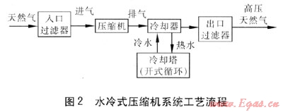 天然氣從入口過(guò)濾器進(jìn)入壓縮機(jī),增壓后的氣體進(jìn)入換熱器列管中,與列管外的冷水進(jìn)行換熱,冷水把氣體放出的熱量吸收并帶走至風(fēng)冷卻器,冷卻系統(tǒng)完全封閉,循環(huán)水在冷熱交換時(shí)不和環(huán)境空氣接觸,熱水被風(fēng)冷卻器風(fēng)扇強(qiáng)制冷卻,降溫后的冷卻水通過(guò)水泵循環(huán)至換熱器。高壓天然氣被冷卻后,通過(guò)出口過(guò)濾器,流進(jìn)下一步工序。