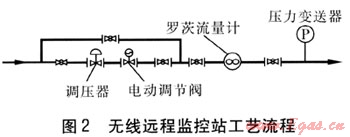 無線遠程監(jiān)控站是在原有的區(qū)域中-低壓調(diào)壓站的基礎上,通過工藝改造增設羅茨流量計、壓力變送器、電動調(diào)節(jié)閥、無線數(shù)據(jù)采集器(RTU)、后備電源以及無線數(shù)傳Modem構(gòu)成。無線遠程監(jiān)控站工藝流程見圖2。無線數(shù)據(jù)采集器是一種具有采集、處理功能的自動化設備,專門針對低功耗、無人值守站而設計,與流量計、壓力傳感器、電動閥門上的數(shù)據(jù)通信接口相連接,按內(nèi)置程序采集數(shù)據(jù)后,執(zhí)行操作指令上傳數(shù)據(jù),由無線數(shù)傳Modem接收信號并解碼壓縮后將信號傳回監(jiān)控中心的工控機。在后備電源的支持下,能夠保證系統(tǒng)在斷電的情況下正常運行48h。