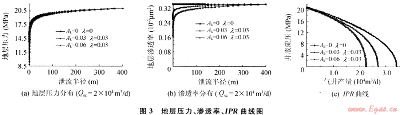 如圖3-a所示,在氣體采出過(guò)程中,地層中存在壓降漏斗;氣井以2×104m3/d生產(chǎn)時(shí),應(yīng)力敏感常數(shù)Ak和啟動(dòng)壓力梯度λ越大,地層中壓力下降越多;且要達(dá)到相同的產(chǎn)量,應(yīng)力敏感和啟動(dòng)壓力梯度影響的氣井,要以更低的井底流壓,更大的生產(chǎn)壓差生產(chǎn)。