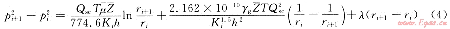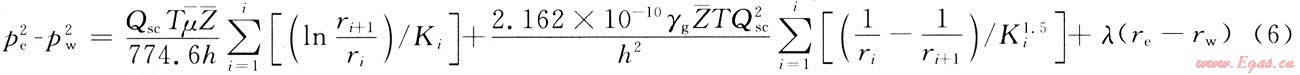 i=3,4,…,n分別帶入式(5)中,可以得到n-2個(gè)類似的方程,并將這n-2個(gè)方程和式(3)和式(4)一起疊加,便可以得到考慮儲(chǔ)層變形和啟動(dòng)壓力梯度、非達(dá)西流動(dòng)的氣井產(chǎn)能方程: