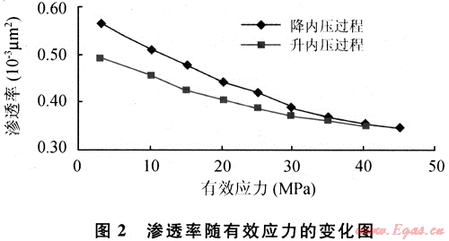 致密低滲透氣藏普遍具有低孔、低滲、束縛水飽和度高的特點(diǎn),由于細(xì)小孔隙喉道處水化膜的封堵作用,氣體滲流往往具有啟動(dòng)壓力梯度特征,作用于氣體兩端的壓力梯度要大于啟動(dòng)壓力梯度才能流動(dòng)[1];同時(shí)許多致密低滲透氣藏具有“應(yīng)力敏感”特征[2]。致密低滲透儲(chǔ)層巖心氣體低速滲流實(shí)驗(yàn)結(jié)果如圖1,在氣體流速和壓力平方梯度的關(guān)系圖上,線性段為達(dá)西滲流段,非線性段不通過(guò)坐標(biāo)原點(diǎn),和x軸的交點(diǎn)即為啟動(dòng)壓力梯度,儲(chǔ)層含水飽和度越高,啟動(dòng)壓力梯度作用才明顯。致密低滲透氣藏儲(chǔ)層滲透率隨有效應(yīng)力的變化如圖2??梢钥闯鲈诮祪?nèi)壓過(guò)程中,滲透率隨有效應(yīng)力的增大而減小,在儲(chǔ)層壓力恢復(fù)的過(guò)程,由于儲(chǔ)層發(fā)生了部分塑性變形,滲透率并不能恢復(fù)到初值。