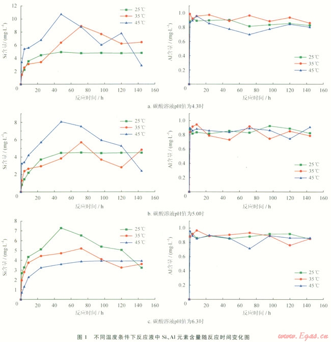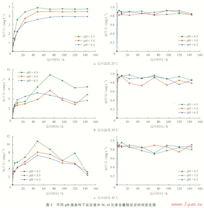 1)反應(yīng)溫度不同時(shí),反應(yīng)溫度越高,Si元素的溶出量越大;隨溫度升高,Al元素的溶出量變化不大。溶液pH值和溫度相同時(shí),隨反應(yīng)時(shí)間增加,反應(yīng)液中Si元素含量先增加后減小,有一定的振蕩。溫度為45℃時(shí),反應(yīng)中si元素含量在48h時(shí)左右達(dá)到最大值,溫度為35℃時(shí),反應(yīng)液中Si元素含量在72h左右達(dá)到最大值,溫度為25℃時(shí),Si元素含量在96 h左右達(dá)到最大值;Al元素含量隨反應(yīng)時(shí)間增加迅速增加,并趨于穩(wěn)定。