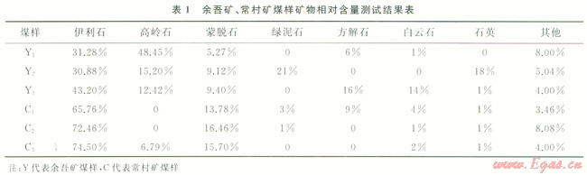目前,沁水盆地東南部的潞安礦區(qū)是傘國(guó)煤層氣開發(fā)的熱點(diǎn)區(qū)域之一。部分井正在進(jìn)行注CO2現(xiàn)場(chǎng)試驗(yàn),為了解煤中主要黏土礦物含量,通過采集潞安礦區(qū)余吾礦和常村礦煤樣,應(yīng)用x射線衍射進(jìn)行了黏土礦物相對(duì)含量測(cè)試,結(jié)果見表1。