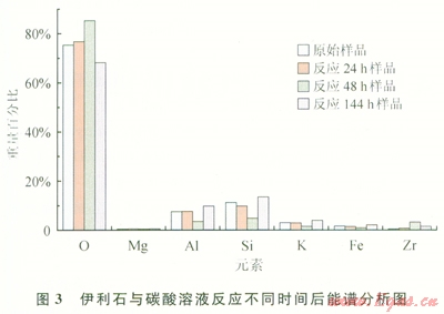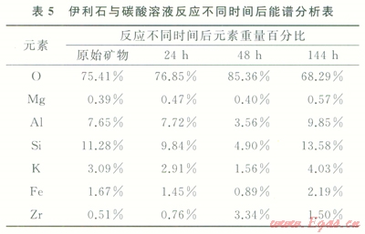 從表5和圖3中可以看出,固相礦物質(zhì)中隨反應(yīng)時(shí)間增加Si、Al元素均呈現(xiàn)出“先減小后增加”的趨勢(shì),但Al元素含量變化較小,si元素含量在48h時(shí)最低,在144h時(shí)si元素含量升高。這與反應(yīng)液中si、A1元素含量的變化相一致;固相中Mg、K、Fe、Zr元素含量隨反應(yīng)時(shí)間增加呈現(xiàn)出減小的趨勢(shì),說明Mg、K、Fe元素發(fā)生了溶解;固相O元素隨反應(yīng)時(shí)間增加先增加后減小,這可能是由于O元素溶出量小于其他元素溶出量大,導(dǎo)致相對(duì)含量增加,在144h時(shí)Si元素等沉淀,導(dǎo)致其相對(duì)含量降低。