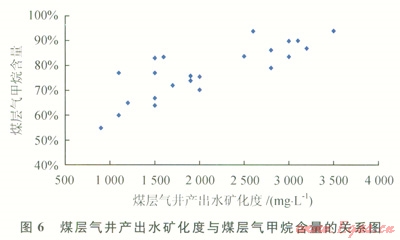 該區(qū)含氣量與礦化度呈正相關(guān)關(guān)系(圖2),東南部地層水礦化度小于1200mg/L的區(qū)域煤層含氣量一般小于2m3/t,而北部地層水礦化度大于1700mg/L的區(qū)域煤層含氣量一般大于4m3/t。同時,煤層氣井產(chǎn)出水礦化度與煤層甲烷含量之間相關(guān)性較好(圖6),煤層甲烷含量隨礦化度增加而增加,東南部煤層氣井產(chǎn)出水礦化度低于1200mg/L的地區(qū),煤層甲烷含量一般低于70%,而北部煤層氣井產(chǎn)出水礦化度高于1700mg/L,煤層甲烷含量一般大于80%。說明東南部距離補(bǔ)給區(qū)較近,地下水活躍,不利于煤層氣的保存,而北部遠(yuǎn)離水源補(bǔ)給區(qū),水動力處于弱徑流區(qū)一滯留區(qū),保存條件好。另外,總體上北部煤層氣井產(chǎn)氣效果也明顯好于東南部,也說明北部煤層氣富集條件優(yōu)于東南部。