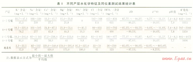 該區(qū)煤層氣井主要采用4+5號煤層和8+9號煤層分壓合排,少量井為單層排采,不同產(chǎn)層煤層氣井產(chǎn)出水水化學(xué)及同位素測試結(jié)果見表1。總體而言,無論是單采4+5號煤層,還是單采8+9號煤層,或者兩套煤層同時開采,處于同一區(qū)域的煤層氣井產(chǎn)出水離子組成差異都較小,但不同地區(qū)煤層氣井產(chǎn)出水陰、陽離子組成差異則較大。