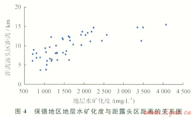 該區(qū)煤層氣井產(chǎn)出水礦化度總體較低,介于842~5072mg/L,平均為1750mg/L,總體變化趨勢由東向西、由南向北礦化度增加(圖2)。由于該區(qū)構(gòu)造為西傾單斜,地下水總體流向為由東向西,隨著距離露頭區(qū)距離的增加,地層水礦化度增高(圖4)。北部開發(fā)區(qū)距離補(bǔ)給區(qū)較遠(yuǎn),而南部距離補(bǔ)給區(qū)較近,因此,南部地層水礦化度小于北部,水動力條件南部較北部活躍。