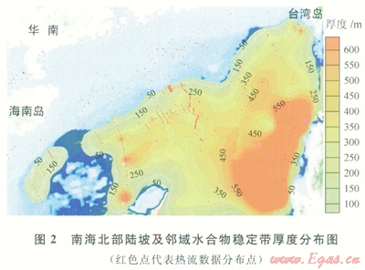 南海北部陸坡區(qū)水深變化范圍介于300~3500m之間,海底溫度介于1.45~9.00℃,而且與水深有很好的相關(guān)性。熱流分布較復(fù)雜(20~170mW/m2)。利用Miles[9]提出的海水中甲烷穩(wěn)定帶邊界曲線方程,以孔隙水鹽度為3.5%,氣體為純甲烷為約束條件,并根據(jù)熱流數(shù)據(jù)、熱導(dǎo)率、水深、海底溫度等參數(shù)進(jìn)行了穩(wěn)定帶厚度估算。計(jì)算結(jié)果表明,南海北部陸坡水合物穩(wěn)定帶厚度介于0~350m,在水深較大海盆區(qū)可超過500m(圖2),在水深小于500m的區(qū)域基本不具備形成水合物的條件。穩(wěn)定域厚度與水深變化呈正相關(guān)關(guān)系,而且水合物穩(wěn)定域受熱流變化驅(qū)動明顯,穩(wěn)定域厚度的變化梯度與熱流值變化梯度有很大相關(guān)性,熱流值變小的地方穩(wěn)定域厚度變?nèi)耄守?fù)相關(guān)關(guān)系。