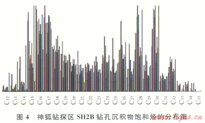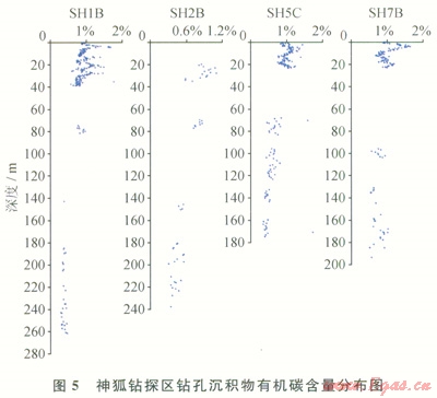在南海北部陸坡淺表層沉積物有機(jī)質(zhì)中正構(gòu)烷烴基本為雙峰形,表現(xiàn)為海相浮游動物、陸源高等植物混合母源特征。神狐鉆孑L沉積物有機(jī)質(zhì)正烷烴為雙峰形分布特征(圖4)。第一主峰碳數(shù)為C17~C19,代表海相浮游動物和藻類,第二主峰碳數(shù)為C29或C31來源于陸源高等植物。其輕重?zé)N比值C21-/C22+介于0.06~5.73,有機(jī)質(zhì)d13C值為-17.3‰~-22.8‰,表明總體上以海相浮游動物和藻類為主,局部存在陸源有機(jī)質(zhì)。鉆孔沉積物TOC介于0.29%~1.77%,各鉆孔頂部層段TOC明顯表現(xiàn)出在高值區(qū)振蕩變化特征,并隨深度的增加TOC值逐漸降低,而到一定深度后,TOC基本保持穩(wěn)定(圖5)。這種有機(jī)碳系統(tǒng)地向下減少是早期成巖階段有機(jī)質(zhì)氧化分解的結(jié)果[17]。由于鉆孔淺部沉積物埋藏時(shí)間短,有機(jī)質(zhì)消耗較少,TOC與沉積物中原始含量比較接近,平均值達(dá)1.2%;而下部層段的有機(jī)碳為經(jīng)過早期成巖階段硫酸鹽還原和微生物發(fā)酵而大量消耗后的穩(wěn)定殘留有機(jī)碳,有機(jī)碳轉(zhuǎn)化率在30%~61%,大多轉(zhuǎn)化為生物甲烷氣,是形成水合物的主要?dú)怏w來源。神狐鉆孔沉積物有機(jī)質(zhì)中含有豐富的烷基苯系列化合物,以短鏈的烷基苯同系物優(yōu)勢為特征,含少量對熱演化敏感的較長鏈的烷基苯同系物,表明有機(jī)質(zhì)熱演化程度很低。此外,部分樣品中存在重排甾烷和4-甲基甾烷,是典型的微生物作用活動標(biāo)志,這與鉆探證實(shí)的水合物主要為微生物氣特征是一致的。