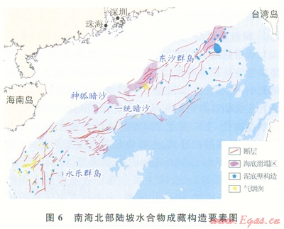 2)南海北部陸坡從西部 中部一東部體現(xiàn)出不同的地質(zhì)構(gòu)造特點(diǎn),其強(qiáng)烈差異性對水合物的富集成藏產(chǎn)生深刻的影響。東部以臺西南盆地北緣成藏條件最為優(yōu)越,水合物主要通過氣體的垂向與側(cè)向結(jié)合運(yùn)聚方式成藏,為復(fù)合型水合物發(fā)育的有利區(qū);中部以珠江口盆地白云凹陷南坡為代表,水合物主要通過氣體的側(cè)向運(yùn)聚模式成藏,驅(qū)動力受淺層流體勢控制明顯,為分散型水合物發(fā)育區(qū);西南部以瓊東南盆地的深水帶成藏條件優(yōu)越,新近紀(jì)來構(gòu)造沉降速率較大,沉積厚度大,泥底辟和氣煙囪體發(fā)育,對水合物成藏控制明顯,水合物主要通過氣體的垂向運(yùn)聚模式成藏,有利于發(fā)育滲漏型水合物藏。