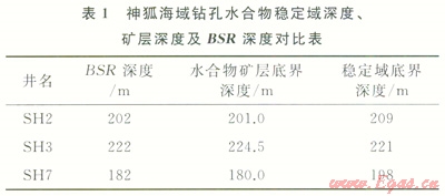 同樣,對神狐海域鉆探區(qū)穩(wěn)定域厚度進(jìn)行了計(jì)算,大量鉆探實(shí)測數(shù)據(jù)為穩(wěn)定域計(jì)算提供了準(zhǔn)確的參數(shù)。鉆探區(qū)熱流值為98.90~62.02mW/m2,在鉆探區(qū)內(nèi)8口先導(dǎo)孔均進(jìn)行了溫度測井和水深測量,在其中5個(gè)取心孔不同深度進(jìn)行了原位地層溫度測量,地溫梯度介于67.60~43.65℃/km。水合物甲烷含量超過99%,為I型水合物。計(jì)算結(jié)果表明,水合物穩(wěn)定域深度與BSR深度以及測井和取心揭示的水合物底界深度基本相符(表1)。鉆探區(qū)穩(wěn)定域厚度在80~224m,海底熱流變化對穩(wěn)定帶分布制約作用明顯,在SH2、SH3和SH7等3個(gè)井位附近,穩(wěn)定域厚度最大,也是熱流值最低的區(qū)域(66~75mW/m2)。