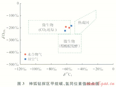 天然氣水合物氣體成因、來源及供給潛力是水合物成藏研究的最基本問題,它決定著水合物形成的物質(zhì)基礎(chǔ)及礦藏的資源潛力。深部的熱成因氣以及由水合物穩(wěn)定帶下部向上運(yùn)移的生物氣對于形成水合物是必需的[10],不同成因類型的烴類氣體具有不同的形成機(jī)理和運(yùn)聚方式,并影響水合物的成藏和分布。目前世界各地發(fā)現(xiàn)的水合物大多數(shù)由微生物氣生成,僅墨西哥灣、黑海、麥肯齊三角洲等地區(qū)的水合物是由熱解氣或混合氣生成的。因此,生物成因氣在水合物成藏研究中得到了較大的關(guān)注。由于頂空氣代表充填在沉積物孔隙或裂隙中的游離氣,與水合物礦藏氣體的成因關(guān)系密切,近年對南海北部陸坡大量淺表層沉積物(海底以下0~10m)中頂空氣的測試分析結(jié)果表明,頂空氣中的d13C1值介于-102.6‰~-24.0‰,平均值為-71.1‰,C1/(C2+C3)值介于6~84659,dD值介于-180‰~145‰,研究表明氣體來源具有多源性,而且在不同區(qū)域有所差別。東沙海域頂空氣的d13C1值為-102.6‰~-38.2‰,平均值為-78.5‰,是以微生物氣為主的混合氣;西沙海域頂空氣d13C1值為-94.2‰~-71.4‰,平均值為-85.5‰,為微生物氣。從神狐鉆探區(qū)情況看,水合物樣品中的烴類氣體以甲烷為主,甲烷含量高達(dá)99.89%和99.91%,C1/(C2+C3)值分別為911.7和1094,d13C1值為-56.7‰和-60.9‰,dD值為-199﹪和-180‰;2個(gè)頂空氣樣品的甲烷含量分別達(dá)99.92%和99.96%,C1/(C2+C1)值分別為1373.5和2447,d13C1值為-62.2‰和-54.1‰,dD值為-225‰和-191‰。神狐鉆探區(qū)呈現(xiàn)以微生物氣為主的混合氣特征[11-12],根據(jù)甲烷碳、氫同位素特征分析,主要為C0。還原型甲烷(圖3),水合物具有自生自儲原地附近運(yùn)聚的成藏特征[13]。
