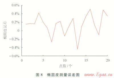 圖7中綠色曲線為檢測系統對該油管的測量結果,紅色曲線為游標卡尺所測量的理論值曲線。黑色曲線中有2處橢圓度測量值比較大,其橢圓度測量值分別為5.6%、9.7%,這與預制缺陷的位置及理論值一致。圖8為游標卡尺所測量理論值與檢測系統的檢測結果的對比曲線,從圖8中可以看出,誤差最大值為0.55%,測量精度達到l%。