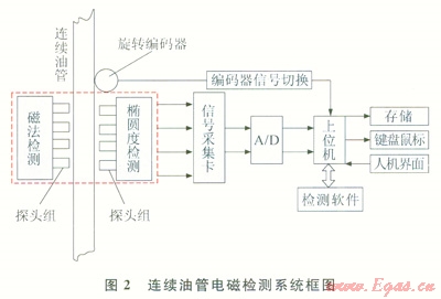 連續(xù)油管是隨著小井眼鉆井技術發(fā)展起來的一種新技術,具有安全可靠、成本低、效率高的特點,解決了許多常規(guī)作業(yè)技術和方式難以解決的難題[1-3],已經成為鉆井領域的技術新熱點[4]。20世紀30年代國外就開展了相關研究工作,近幾年國內相關科研院所通過技術引進和自主研發(fā)已經成功開發(fā)了具有自主知識產權的連續(xù)油管作業(yè)車[5-6]。連續(xù)油管工作環(huán)境復雜,在常規(guī)作業(yè)中要受到多種交變載荷的共同作用,極易形成缺陷。因此,連續(xù)油管在工作壽命期內應進行監(jiān)測,一旦其管壁厚度達到規(guī)定的極限、橢圓度超過一定數值或發(fā)現油管表面存在缺陷,就不得再使用。然而,現在國內對連續(xù)油管的檢測仍處于實驗室研究階段,還不能很好地將其用于現場的在線檢測中,且檢測方式大都集中在裂紋、腐蝕等缺陷檢測方面,無法實現對連續(xù)油管的全面檢測。筆者根據連續(xù)油管在線檢測需求,基于微磁檢測技術和電渦流檢測技術,研制了連續(xù)油管電磁檢測系統樣機,檢測效率高、穩(wěn)定、可靠。