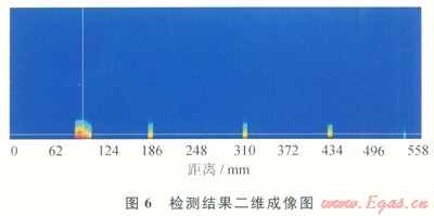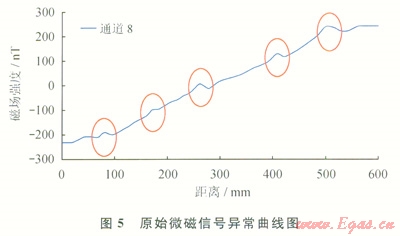 實驗過程中,連續(xù)油管以1m/s的速度(實際作業(yè)時的速度)在機械裝置中抽動。圖5是某通道原始磁信號曲線,可以看出分別在95mm、185mm、298mm、421mm、525mm處出現了向上(因為用線切割預制的缺陷類似裂紋、腐蝕缺陷)的磁信號異常,這就是工件上所預制的5個人工缺陷。圖6檢測結果二維成像圖更加明顯,直觀表示了這些缺陷和大小。圖4表明了5個缺陷在油管上準確位置分別是l02mm、191mm、295mm、424mm、527mm,這與實際檢測的位置相比最大絕對誤差為7mm(第1個缺陷),相對誤差不到1%。