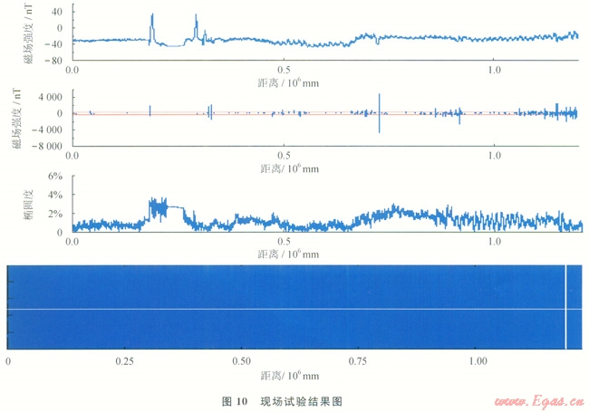 在重慶某井進行了在線檢測現場試驗(圖9),檢測長度為6000m,檢測結果如圖10所示,圖10中從上到下4個部分為原始信號曲線、處理信號曲線、橢圓度曲線、二維成像圖。從圖10中所顯示的二維缺陷成像圖可以看出,油管沒有大的缺陷,僅僅在被檢油管的181m處存在深度為0.5mm、面積為40mm2的表面細微損傷。通過橢圓度曲線可以看出,被檢油管1669.6m處橢圓度為4.9%,1688.5m處橢圓度為4.5%,1700.5m處橢圓度為4.2%,其他各處橢圓度均小于4.0%,與實際油管的損傷情況一致。
