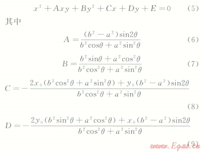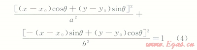 在平面內要確定1個橢圓共需5個參數:橢圓中心坐標(x0,y0)、長軸半徑a、短軸半徑b、長軸與x軸的夾角q。則在平面任意位置橢圓的方程可表示: