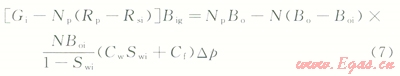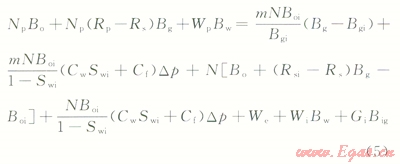2)地面的累積產(chǎn)氣量為Gp,Gp=NpRp,Rp為累積生產(chǎn)氣油比。而在p壓力下累積產(chǎn)油量Np的溶解氣量為NpRs,Rs為p壓力下的溶解氣油比。因此,地層壓力由pi下降到p時(shí),由油藏中多產(chǎn)出的天然氣地下體積量為Np(Rp-Rs)Bg,Bg為p壓力下的天然氣體積系數(shù)。