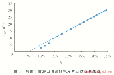 根據(jù)上述方法,計(jì)算了興古7古潛山油藏在氣驅(qū)開(kāi)發(fā)過(guò)程中,油層中部深度地層壓力保持在27.25MPa下的原油不同采出程度(Ro)時(shí)所對(duì)應(yīng)的地下儲(chǔ)氣庫(kù)庫(kù)容量,當(dāng)油藏達(dá)到最終采收率為34.48%、地層壓力為30MPa時(shí),地下儲(chǔ)氣庫(kù)的庫(kù)容量為30.52×108m3(圖1)。