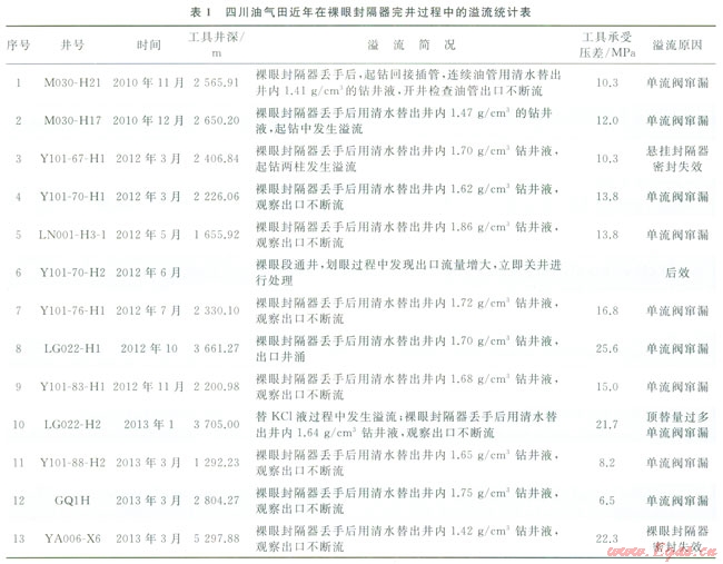 統(tǒng)計(jì)川渝地區(qū)近年在裸眼封隔器完井作業(yè)時共發(fā)生溢流有14井次(表1)。表中反映了溢流多發(fā)牛在采用KC1完井液替換裸眼段鉆井液和坐封管柱丟手后用清水替出井內(nèi)鉆井液2種工況。