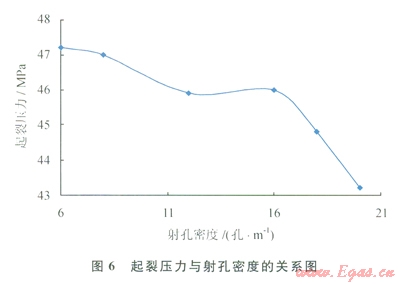 根據(jù)射孔密度與起裂壓力的關(guān)系(圖6) [7-8],隨著射孔密度的增加,裂縫起裂(破裂)壓力呈降低趨勢。當(dāng)孔密從6~16孔/m變化時,起裂壓力降低不明顯,但從16~20孔/m變化時,起裂壓力顯著降低。在考慮套管強度條件下,元壩陸相井目的層射孔密度都選擇為16孔/m。