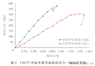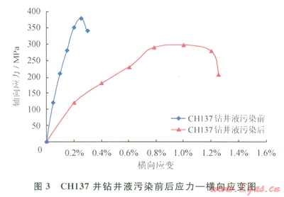 地層條件下,鉆井液浸泡對巖石三軸力學(xué)參數(shù)有較大影響(圖3、4)。由圖3、4可以看出,在50MPa壓力下,巖樣經(jīng)過5d、10d的鉆井液浸泡后,巖石抗壓強度和彈性模量顯著下降,而泊松比增大(CHl37井鉆井液浸泡前泊松比為0.28;鉆井液浸泡后泊松比為0.67),使得巖石破裂時橫向變形和軸向變形增加,增加了巖石抵抗破裂的能力。表明泊松比增加,巖石破裂壓力增加。