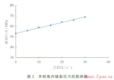 在鉆井過程中,若井眼方向與地層垂向應(yīng)力方向不平行,會導(dǎo)致壓裂施工時破裂壓力偏高(圖2)。由圖2可見,隨著井斜角增加,破裂壓力相應(yīng)增加。元壩陸相有些井是斜井或水平井,也是引起儲層高破裂壓力的原因之一。如YB2-側(cè)1井珍珠沖組一須二段下層、YL6井須二段、YL10井珍珠沖組和須二段、YL601H井須二段、YL701井須三段上層等,這些井都是斜井或水平井,井斜也引起破裂壓力明顯升高,破裂壓力梯度為0.027~0.037MPa/m。