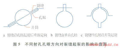 當(dāng)孔眼與最佳平面有一定夾角時,夾角越大,破裂壓力越高,裂縫從孔眼處起裂的機會就越小,若裂縫不從孔眼處起裂,將出現(xiàn)圖5的情況而顯著增加破裂壓力。