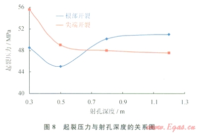 根據(jù)裂縫起裂壓力與射孔深度的關(guān)系(圖8) [7],從射孔根部起裂時,隨著孔深增加,起裂壓力先減小后增加,射孔深度為0.5m時,起裂壓力最低。因為孔深較小時,鉆井引起的近井筒應(yīng)力變化沒消除,限制了裂縫起裂,所以起裂壓力增加;當(dāng)孔深增大時,孔眼尖端不受近井筒應(yīng)力的影響,所以孔眼根部起裂壓力降低。當(dāng)射孔深度超過0.5m時,孔眼尖端與根部的應(yīng)力區(qū)相互影響較小,起裂壓力增加;但當(dāng)孔眼深度達到0.8m后,起裂壓力增加不明顯。表明孔深達到一定深度以后,孔眼尖端與根部應(yīng)力相互影響消失,起裂壓力小再隨孔深增加而增加或增加不明顯。