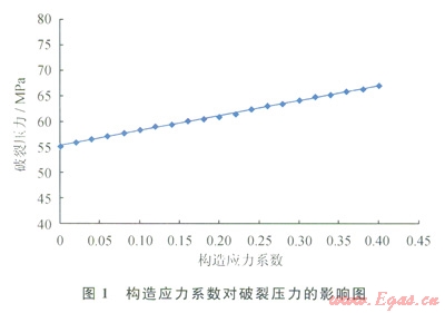 圖1是構(gòu)造應(yīng)力與破裂壓力的關(guān)系。由圖1可見,隨著構(gòu)造應(yīng)力系數(shù)增加,破裂壓力呈線性增加。當(dāng)構(gòu)造應(yīng)力系數(shù)從0增加到0.4時,破裂壓力從55MPa增加到67MPa,增幅達21.8%。元壩地區(qū)構(gòu)造處于強應(yīng)力作用區(qū),地層破裂壓力普遍偏高,如位于九龍山構(gòu)造帶南翼,毗鄰西北龍門山構(gòu)造帶強應(yīng)力區(qū)的YL2井須四段、YB6井須三段、YL6井須二段、YL10井須三段等,地層破裂壓力梯度為0.030~0.035MPa/m。其中,YL2井、YB6井在破裂壓力梯度大于0.030MPa/m下未能壓開地層。