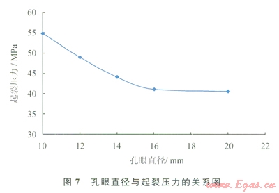 根據(jù)裂縫起裂壓力與射孔孔徑的關(guān)系(圖7) [7],裂縫起裂(破裂)壓力隨孔眼直徑的增加呈下降趨勢。因此,射孔時應(yīng)盡可能選擇較大直徑的射孔彈進行射孔。但在相同的射孑L條件下,射孔孔徑越大,則射孔深度越小,為了兼顧射孔孔眼深度,元壩陸相井目的層射孔孔眼直徑多選擇在12~16mm范圍。