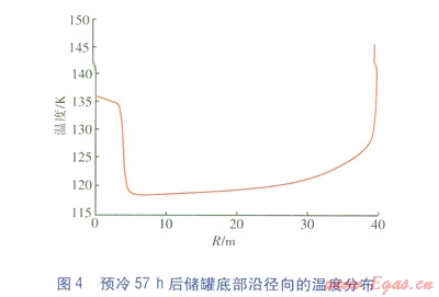 點(0,0)處的溫度隨預冷時間的變化見圖3,預冷57h后儲罐底部沿徑向的溫度分布見圖4。從圖3可以看出,儲罐底部中心(即點(0,0)處)的溫度并不是隨著預冷過程的進行而一直降低的,當儲罐底部溫度降低到一定程度后,底部中心出現(xiàn)了溫度不降反升的現(xiàn)象。從圖4也可以看出,底部中心區(qū)域的溫度高于其他位置(除靠近側壁處)。這是因為噴淋的液滴到達儲罐底面后,在底面氣化,產生的氣體無法及時沿底面向四周擴散,積聚在儲罐底部的中心區(qū)域,形成二次回流,二次回流阻礙了儲罐底面與內部低溫氣體的對流換熱。同時,底部的混凝土向內部的導熱還在繼續(xù),因此在二次回流區(qū)出現(xiàn)了溫度不降反升的現(xiàn)象。隨著預冷的繼續(xù),底部混凝土的熱量充分釋放,液滴在儲罐底面處的氣化量減小,產生的新氣體量減少,二次回流區(qū)逐漸被壓縮,底部中心區(qū)域的溫度又重新下降。