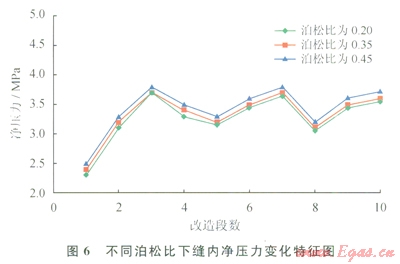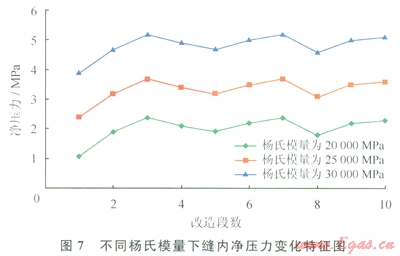 為進(jìn)一步研究儲層巖石力學(xué)參數(shù)對應(yīng)力陰影的影響,設(shè)置不同泊松比和楊氏模量進(jìn)行研究??疾觳此?span lang="EN-US">0.2、0.35、0.45比時,結(jié)果表明泊松比對應(yīng)力陰影的影響較小,即便在泊松比為0.5的極端情況下,導(dǎo)致的凈壓力變化幅度仍不大,因此產(chǎn)生的應(yīng)力影響很小(圖6)??疾鞐钍夏A?span lang="EN-US">20000MPa、25000MPa、30000MPa等3種情況,研究表明:楊氏模量對裂縫內(nèi)凈壓力值的變化影響較大,產(chǎn)生的應(yīng)力陰影現(xiàn)象越強烈,楊氏模量越高對裂縫應(yīng)力陰影效果影響也較大(圖7)。因此,儲層巖石力學(xué)參數(shù)中楊氏模量對應(yīng)力陰影現(xiàn)象的影響最敏感。