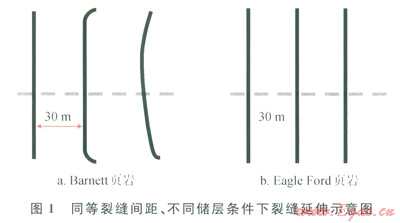 隨著工具設(shè)備及水平井改造技術(shù)的不斷進(jìn)步,儲層多段改造的規(guī)模、段數(shù)等越來越多[8-9]。水力壓裂沒計師可利用分簇射孔將分段改造距離設(shè)置得越來越近,但往往過多的分簇與分段未必就帶來理想的效果,Roussel認(rèn)為應(yīng)力陰影效應(yīng)的產(chǎn)生機理主要在于支撐劑的填充導(dǎo)致人工裂縫附近引起了應(yīng)力場的變化,蔣廷學(xué)等也在研究我國頁巖氣壓裂設(shè)計中指出,壓裂在單一裂縫脆弱面上產(chǎn)生誘導(dǎo)應(yīng)力的存在,并指出產(chǎn)生應(yīng)力陰影的誘導(dǎo)應(yīng)力可以改變最大與最小主應(yīng)力的分布,使裂縫發(fā)生轉(zhuǎn)向[10]。述研究表明,應(yīng)力陰影效應(yīng)可引起人工裂縫從水平井的橫切縫中開始偏離朝向或遠(yuǎn)離以前的裂縫方向延伸,使得下一裂縫發(fā)生轉(zhuǎn)向。Barnctt頁巖裂縫間距30m時水平井壓裂裂縫產(chǎn)生的應(yīng)力陰影效應(yīng)如圖1-a所示,可見從第二條裂縫開始裂縫出現(xiàn)了與主縫向切的裂縫系統(tǒng),而Eagle Ford頁巖壓裂的裂縫監(jiān)測情況,同樣是30m的裂縫間距沒有出現(xiàn)裂縫應(yīng)力陰影效應(yīng)(圖1-b)。因此研究陰影效應(yīng)的產(chǎn)生機理,建立分析數(shù)學(xué)模型并進(jìn)行其影響因素分析對水平井分段體積改造優(yōu)化設(shè)計及效果的提升具有重要研究與應(yīng)用價值。