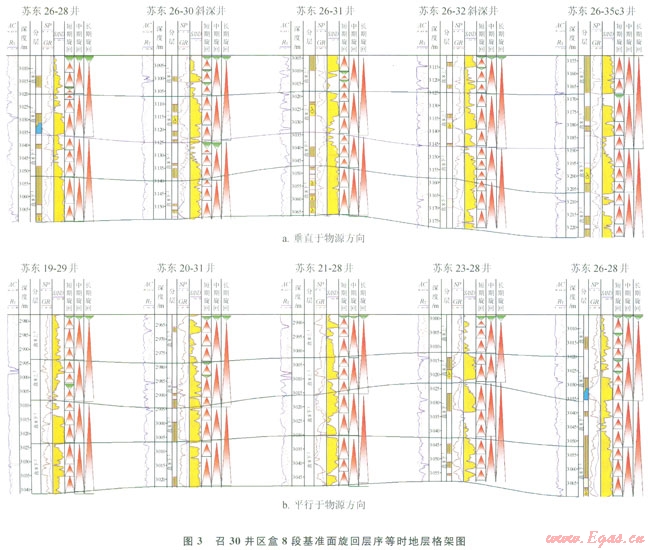 蘇里格地區(qū)盒8段砂體構(gòu)型可分為復合河道砂體和單一河道砂體,前者被稱為疊置河道砂,后者被稱為單河道砂。本文以層序地層學理論為依據(jù),在層序地層界面識別的基礎(chǔ)上,建立了召30井區(qū)盒8段高分辨率層序地層格架,通過中期基準面的對比識別出疊置河道砂,進而通過短期基準面的對比識別出單河道砂,并定量刻畫該地區(qū)盒8段河道帶及河道砂體規(guī)模,建立儲集砂體構(gòu)型,以期為氣田開發(fā)過程中的井距優(yōu)化和天然氣“甜點”的選擇提供依據(jù),提高氣田開發(fā)效益。