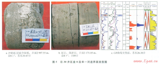 單一河道是指較長周期的大洪水期形成的具有一定分布范圍的河道單元,其識別的意義在于復合河道內(nèi)垂向上的單一河道單元的劃分,每一期次洪水的流量、流速不盡相同。因此可以依據(jù)河道內(nèi)的泥質(zhì)層、細粒沉積的發(fā)育位置、沖刷面以及測井曲線的突變來對其進行識別[20]。區(qū)內(nèi)單一河道的界面表現(xiàn)為(5):①沖刷面,代表洪水對前期沉積物的改造,多含泥礫;②泥巖及粉砂巖沉積,代表憩水期水體能量相對較弱時的細粒沉積,保存程度視后一期洪水能量的強弱而定;③測井曲線(GR)突變面。通過以上3種界面對召30井區(qū)盒8段短期基準面旋回內(nèi)單一河道進行識別,每個短期旋回內(nèi)均發(fā)育23期單一河道沉積。