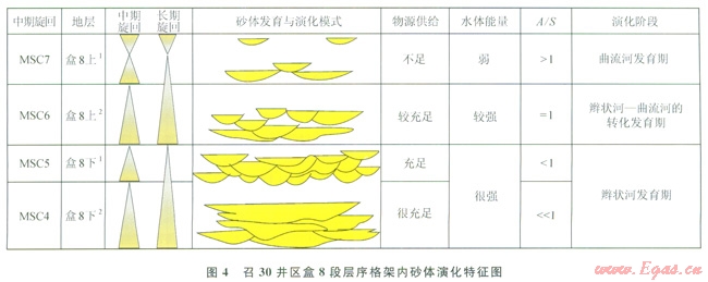 LSC2即盒8段上部層序由2個中期旋回(MSC3MSC4)組成,底部旋回(MSC3)為向上變的非對稱型,該中期旋回由23(SSC7SSC9)短期旋回組成,短期旋回由A(向上變深非對稱型)C(對稱型)過渡,表明基準面有所抬升,可容納空間增大;頂部旋回(MSC4)為以上升半旋回為主的不完全對稱型,此時源區(qū)構(gòu)造相對穩(wěn)定,物源供給量相對減少,基準面抬升,可容納空間增大,AS值大于1,該中期旋回由23個短期旋回組成(SSCl0SSCl2)。