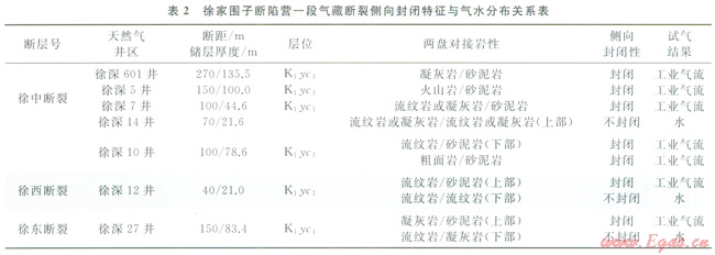 由表l中可以看出,徐家圍子斷陷日前已發(fā)現(xiàn)的氣藏,如徐深1—徐深6井區(qū)、徐深7井區(qū)、徐深41徐深l7井區(qū)、徐深14—徐深l2井區(qū)、徐深12井區(qū)、徐深27井區(qū)、徐深9井區(qū)、徐深l3—肇深11井區(qū)營一段火山巖氣藏皆為受三大斷裂遮擋形成的氣藏,其在天然氣運(yùn)聚成藏期——青山口組沉積之后至今在側(cè)向上是否封閉是決定氣藏能否形成的關(guān)鍵。