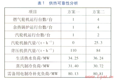 考慮到最惡劣條件下,方案一中抽凝式汽輪機(jī)系統(tǒng)發(fā)生事故,方案二中有1套抽凝式汽輪機(jī)系統(tǒng)發(fā)生事故,兩個(gè)方案供熱可靠性分析見表1。