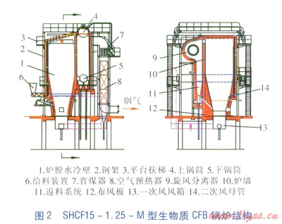 循環(huán)流化床燃燒具有傳熱性能好、燃燒效率高、有害氣體排放少、熱容量大等優(yōu)點,很適合燃用含水量高、熱值低的生物質(zhì)燃料。SHCF15-1.25-M型生物質(zhì)CFB鍋爐結構合理,燃燒效率及熱效率高,深受用戶好評,具有廣闊的市場前景。