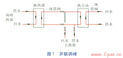 這種方式是目前國內(nèi)常見的調(diào)峰形式,考慮調(diào)峰熱源的相對位置及容量大小,又可細(xì)分為裂解調(diào)峰(調(diào)峰熱源與主熱源分別運(yùn)行)和并聯(lián)調(diào)峰(見圖1)。并聯(lián)調(diào)峰是調(diào)峰熱源高溫?zé)崴M(jìn)入換熱器與主熱源一級管網(wǎng)循環(huán)水進(jìn)行熱交換,使一級管網(wǎng)循環(huán)水升溫后輸送至各熱力站,與二級管網(wǎng)換熱。調(diào)峰熱源處于管網(wǎng)前端時,適宜裂解調(diào)峰;調(diào)峰熱源處于管網(wǎng)水力工況薄弱點時適宜并聯(lián)調(diào)峰,在滿足熱負(fù)荷的前提下,能改善管網(wǎng)末端水力工況。