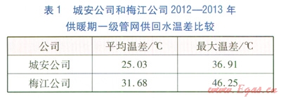 天津市城安熱電有限公司(以下簡稱城安公司)和天津市梅江供熱公司(以下簡稱梅江公司)20122013年供暖期一級管網(wǎng)供回水溫差比較見表1。由表1可知,城安公司一級管網(wǎng)供回水溫差與梅江公司差距較大。