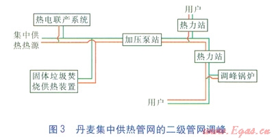 二級管網(wǎng)調(diào)峰多出現(xiàn)于東歐國家,比如丹麥集中供熱管網(wǎng)的調(diào)峰鍋爐設(shè)置(見圖3)就很有代表性[1-3]。