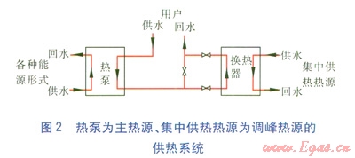 當(dāng)今,多熱源熱泵技術(shù)日臻成熟,太陽能、風(fēng)能、污水、土壤等眾多熱源均可作為低品質(zhì)熱源,通過熱泵轉(zhuǎn)換為高品質(zhì)熱源供熱。因此,在天津市能源集團(tuán)“全市一網(wǎng)”戰(zhàn)略部署中,設(shè)置大型熱泵能源站,以熱泵為主熱源承擔(dān)廣大熱用戶的基本負(fù)荷,以集中供熱的熱水為調(diào)峰熱源,在尖峰時段加熱熱泵低溫?zé)崴?,充分利用熱泵能源的同時,也大大減小了集中供熱的一級管網(wǎng)流量,為實現(xiàn)集中供熱大規(guī)模化、更多地?fù)屨脊崾袌龇蓊~起到了至關(guān)重要的作用。熱泵為主熱源、集中供熱熱源為調(diào)峰熱源的供熱系統(tǒng)見圖2。