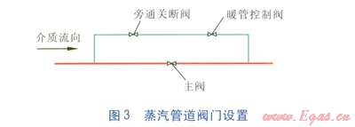 蒸汽管道的啟動需要有一個暖管過程。CJJ 3420108510條要求蒸汽管道啟動暖管需控制流量時,管道閥門應(yīng)裝設(shè)口徑較小的旁通閥作為控制閥門”。這是由于主閥口徑較大時,若暖管過程使用主閥小開度暖管,高速蒸汽通過主閥小開度的縫隙,蒸汽分子或管道內(nèi)的其他微小雜質(zhì)顆粒沖刷密封面,使密封面遭到破壞。CJJ 34—2010要求蒸汽管道啟動暖管需控制流量時管道閥門應(yīng)裝設(shè)口徑較小的旁通閥作為控制閥門無疑是正確的,因為這樣做可以保護大口徑主閥。但是還應(yīng)該注意小口徑旁通閥的時徑和閥門類型的合理選擇,根據(jù)我們的實踐經(jīng)驗,小口徑旁通閥的口徑應(yīng)按主閥口徑的110選取,但最小不應(yīng)小于DN 50mm。而且小口徑旁通閥應(yīng)設(shè)置兩個(見圖3),一個作為暖管時的控制閥,另一個作為旁通管的關(guān)斷閥,這兩個小口徑閥門均應(yīng)選擇截止閥。這是因為蒸汽暖管時間較長,有時候控制閥暖管時的開度仍然較小,仍然有較大可能因高速蒸汽通過控制閥小開度的縫隙時將控制閥的密封面破壞,如果不再設(shè)置一個旁通關(guān)斷閥,一旦暖管控制閥的密封面被破壞,主閥的關(guān)閉將起不到關(guān)斷管路的作用。