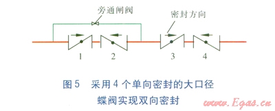 經(jīng)研究,如圖5所示采用4個單向密封的大口徑蝶閥,達到雙向密封的目的,而且采取保護措施,可以使大口徑蝶閥長期處于良好工作狀態(tài)。